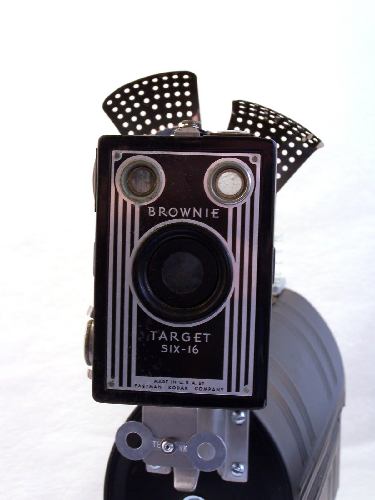 Principal Parts: Lunch box, jello molds, industrial hook, vintage (circa 1946) Brownie camera, industrial spring, test link, strainer parts, and various nuts and bolts.